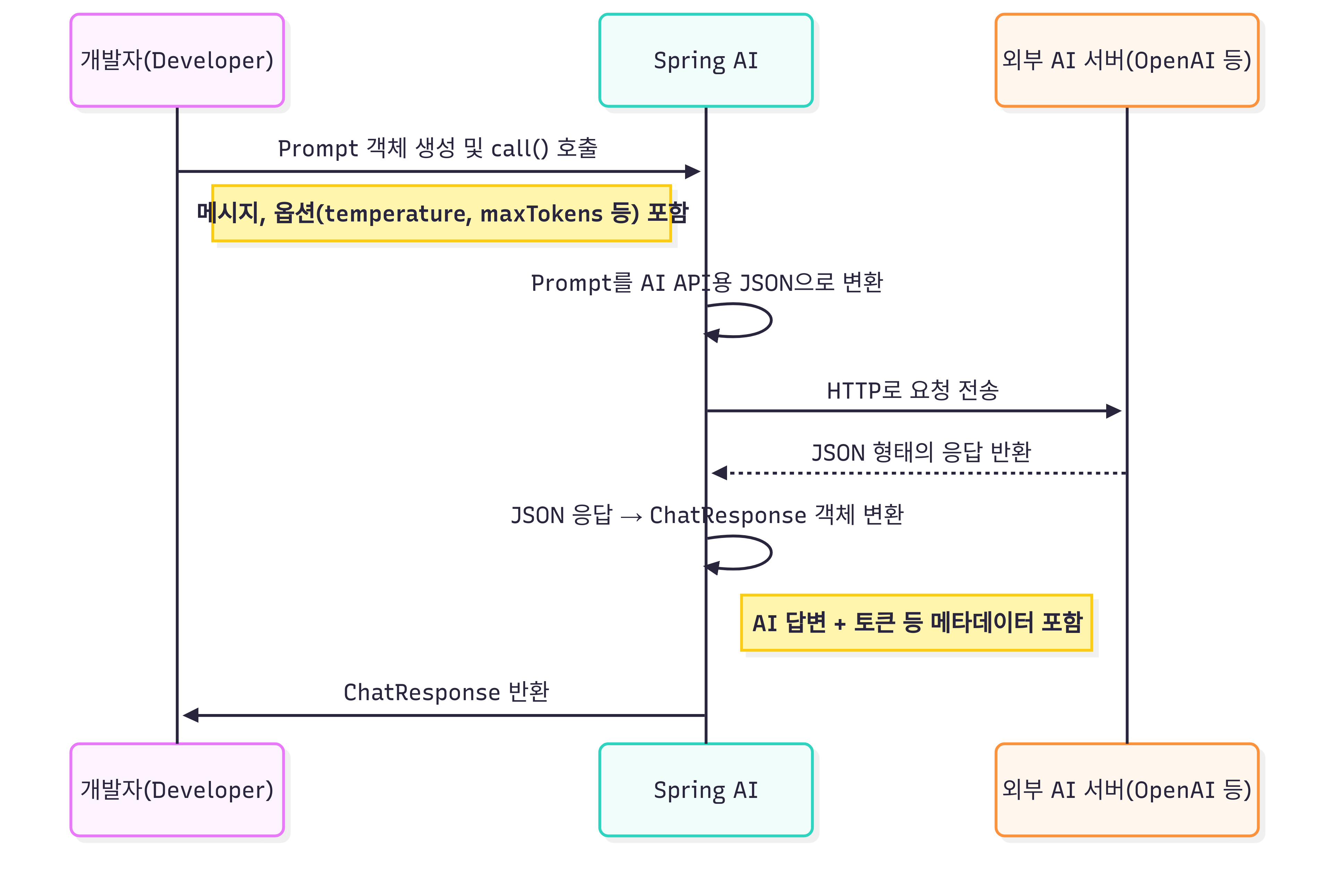 - 결과 변환: 벤더로부터 받은 응답을 Spring AI의 표준 응답 객체인 ChatResponse로 다시 변환하여 반환합니다.