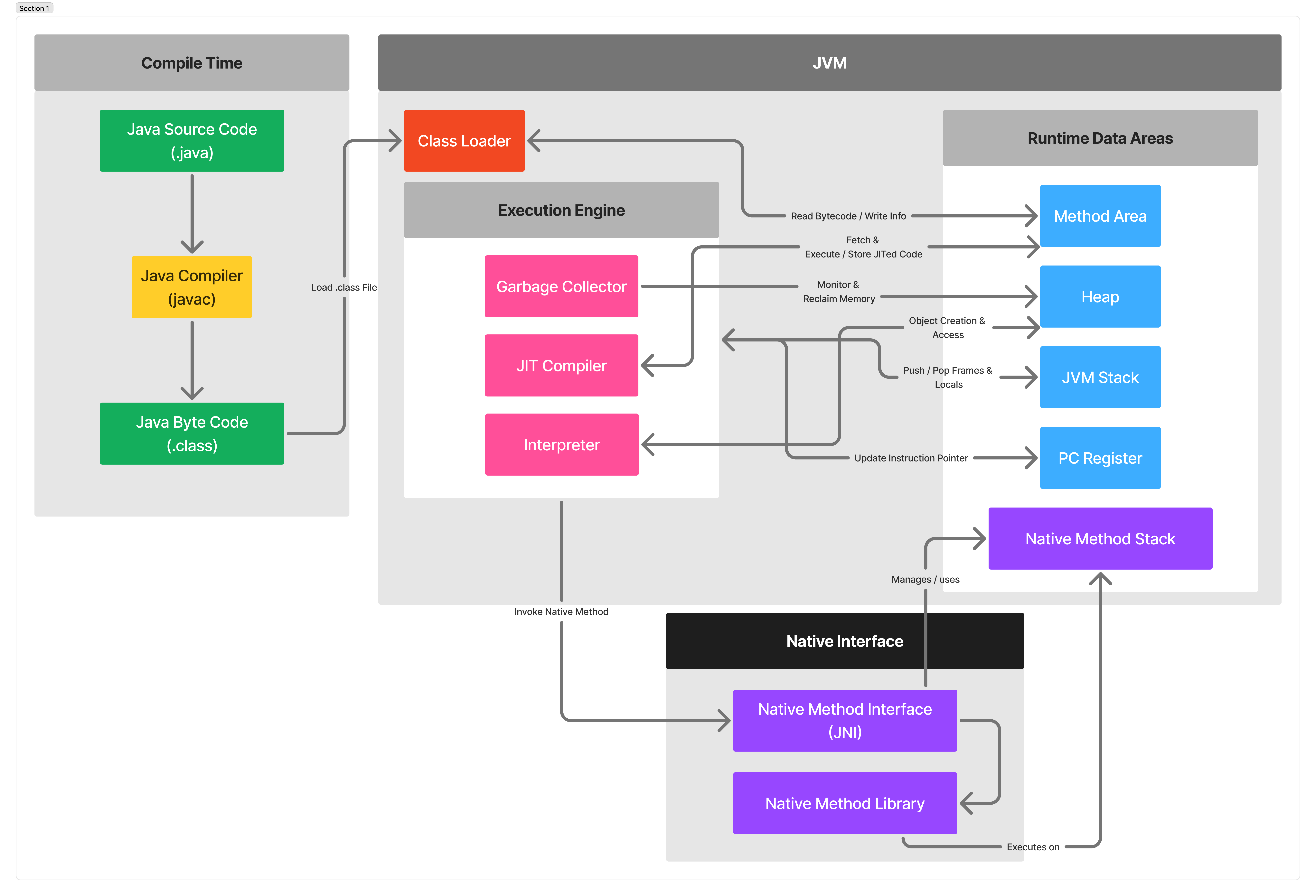 클래스 로딩이 끝나면 실행 엔진(Execution Engine)이 본격적으로 바이트 코드를 실행합니다. 이 과정은 인터프리터, JIT 컴파일러, 그리고 JNI(Native Interface)을 통해 이루어집니다.