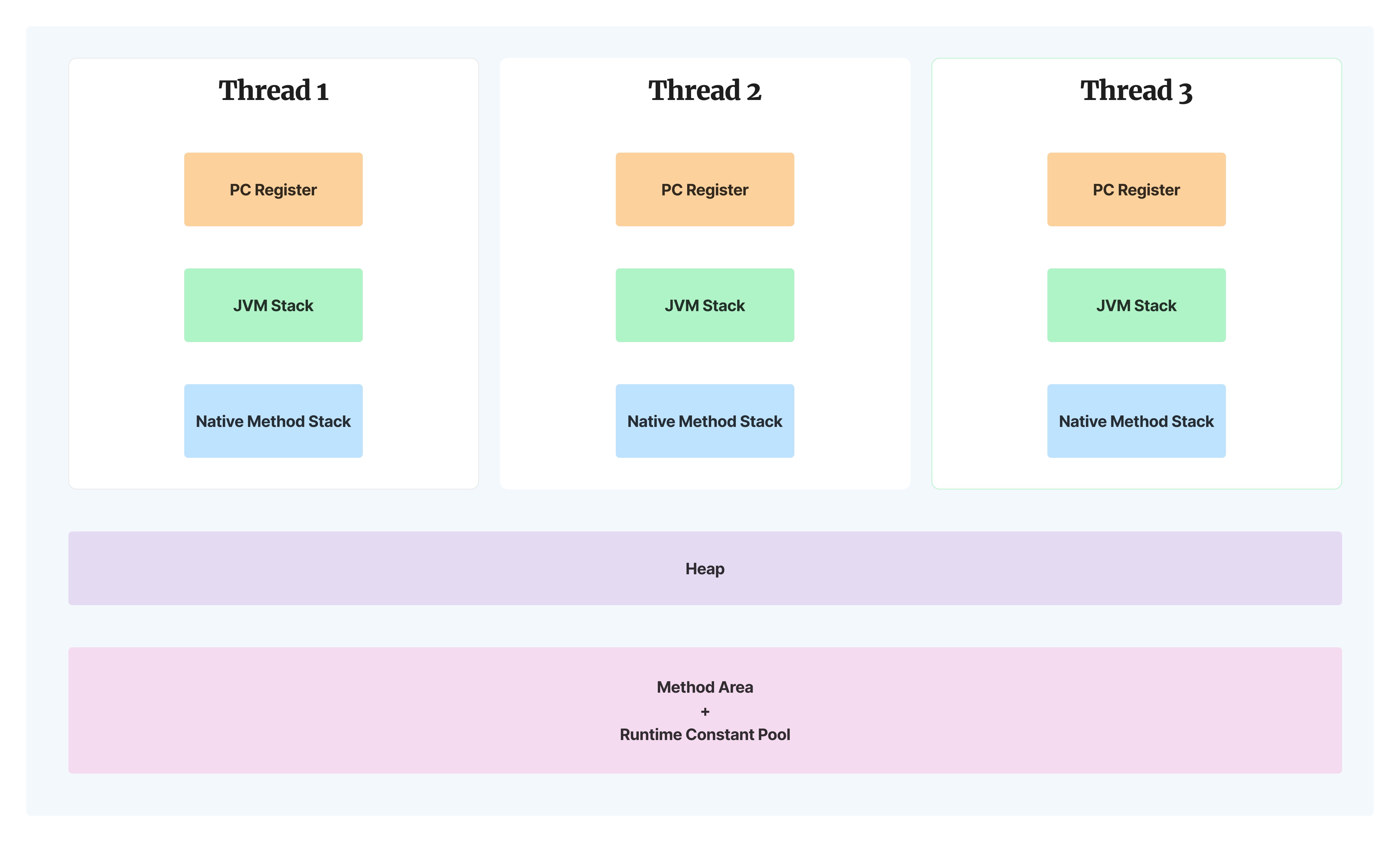 이 영역은 데이터의 라이프사이클과 가시성에 따라 크게 '모든 스레드 공유 영역(per-process)'과 '스레드별 격리 영역(Per-Thread)'으로 구분됩니다.