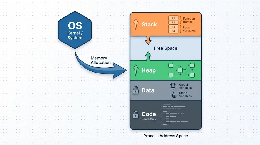 - Stack: 함수 호출 시 지역 변수, 매개 변수, 리턴 주소 등이 저장되는 영역.