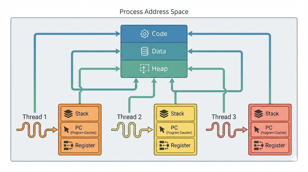 - PC (Program Counter) & Register: 각 스레드는 코드를 어디까지 실행했는지(문맥)를 따로 기억해야 하므로, 레지스터 값은 독립적으로 가집니다.